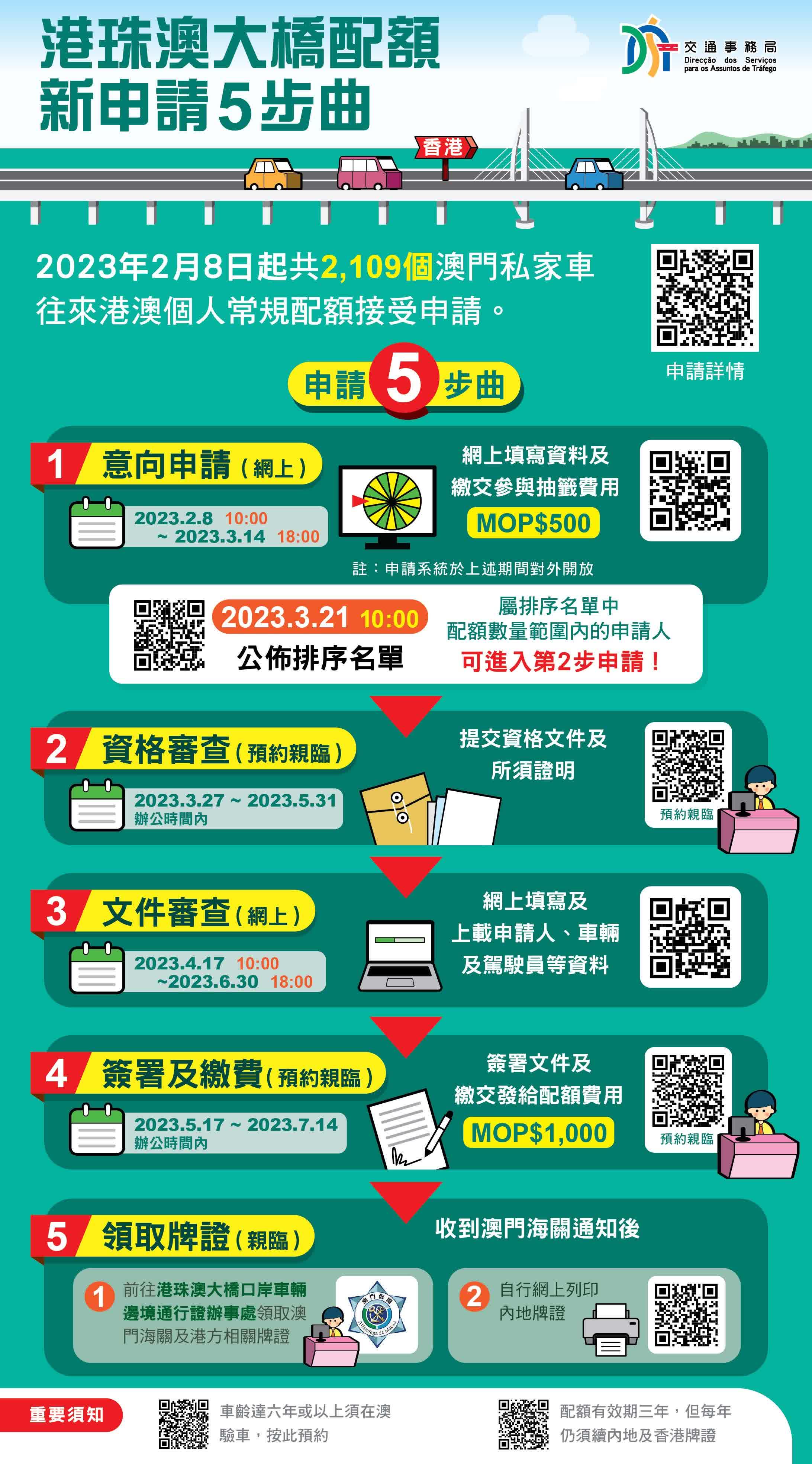 此外,澳門昨日(26日)起推出2109個澳門私家車往來港澳個人常規配額予公眾申請。經評估需求情況,是次將以個人配額供申請,有意申請並符合資格人士可於2月8日上午10時至3月14日下午6時前到交通事務局網頁提交意向申請表及繳交參與抽籤費用500澳門元,上述配額有效期為3年,每個配額費用為1000澳門元。